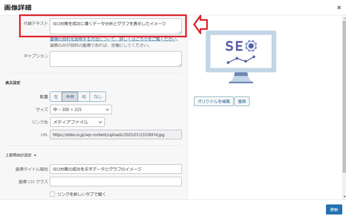 <a href=”https://elate.co.jp/wp-content/uploads/2025/01/23338916.jpg”><img class=”aligncenter wp-image-2138 size-medium” title=”SEO対策の成功を示すデータとグラフのイメージ” src=”https://elate.co.jp/wp-content/uploads/2025/01/23338916-300×225.jpg” alt=”SEO対策を成功に導くデータ分析とグラフを表示したイメージ” width=”300″ height=”225″ /></a>